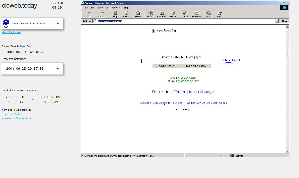 2001年6月18日、URLはGoogle(http://www.google.com)、ブラウザはIE4.0 Windowsで実行してみましょう。