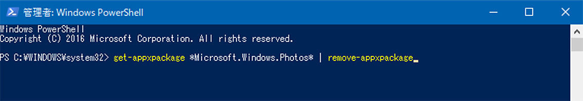 フォト:get-appxpackage *Microsoft.Windows.Photos* | remove-appxpackage