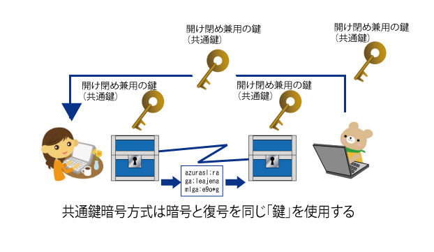 暗号化の送受信の方法には「共通鍵暗号方式」と「公開暗号方式」があります。