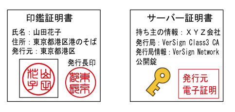 例えば個人の実在証明を行うには「印鑑登録」があります。印鑑登録には印影、持ち主の住所、発行する自治体名があります。サーバー証明書はこれと同じように「公開錠」(印影)、発行者名(持ち主の住所)、発行局の情報(自治体名)という情報があります。このサーバー証明書があることによってきちんと信頼を受けたサーバーで管理と行っているという証になります。