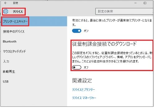 [更新オプション]セクションで、 従量制のデータ接続切り替えスイッチでも、更新の自動ダウンロードをオフにします。