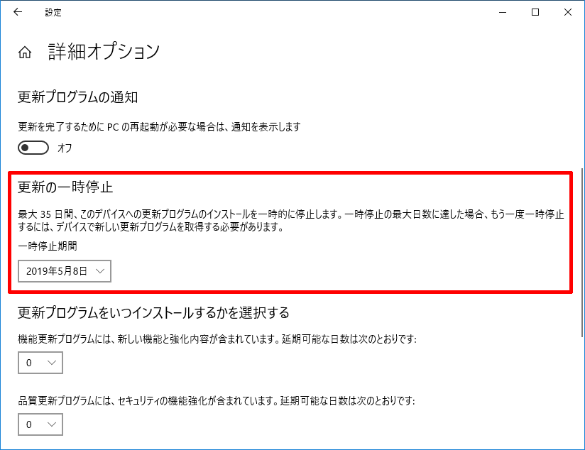 手順を完了すると、デバイスは最大35日間、Windows Updateを通じて機能または品質の更新をダウンロードしません。