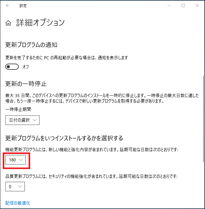 機能更新プログラムのインストールを約1週間延期するには、次の手順を使用します。