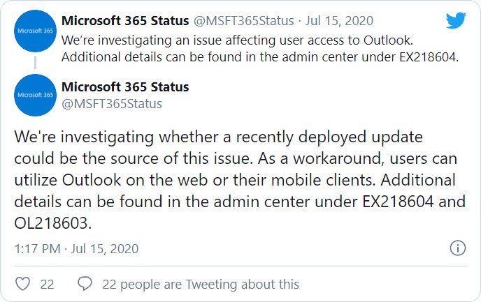 この問題はMicrosoft365のアップデートによって引き起こされ、Microsoft 365 ステータス Twitter アカウントは、この問題について調査しているとツイートしています。