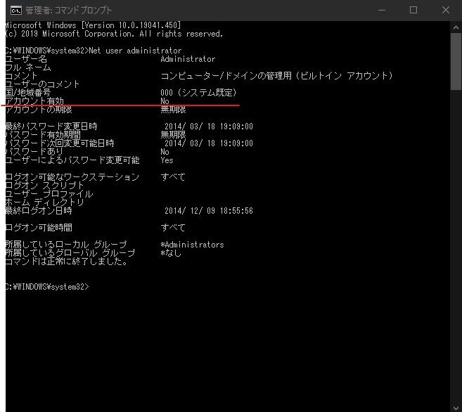 この中でアカウント有効がNoになっている場合は現在は無効状態となっています。有効の場合はすでにAdministratorでログオンすることが出来ます。