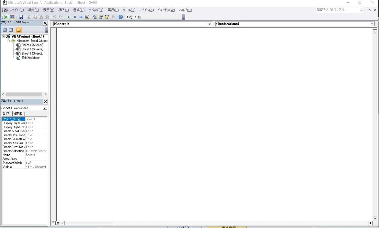 これで、プログラムを入力する画面が出てきました。もし、右側の画面が白ではなくグレーになっている場合は、左側の「Sheet1(Sheet1)」という所をダブルクリックしてください。そうすると、右側が白くなります。