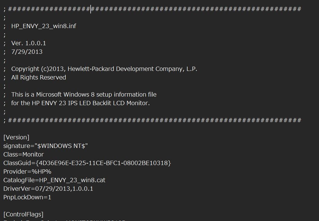 各ファイルの中身の記載はまちまちですが、ほとんどは最初のタイトルの所にメーカー名や何のドライバなのか記載されています。書いていない場合はどこかにそれらしき文字が入っています。