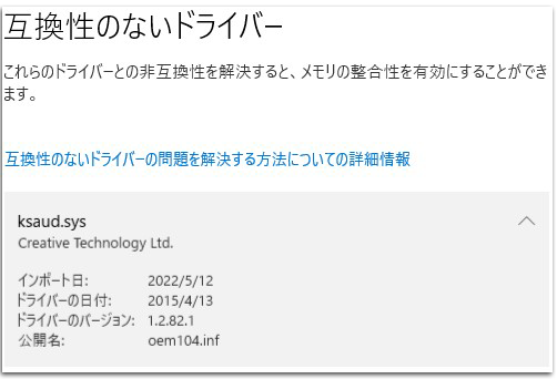 コア分離のメモリ整合性のチェックで検出された互換性のないドライバーは現在使用しているドライバーだけではありません。過去に使用して現在使用していないドライバーも検出するため、ほとんどの検出されたドライバーは過去のドライバーだということになります。現在のドライバーはWindowsUpdateで最新の状態にしている限り互換のあるドライバーになります。