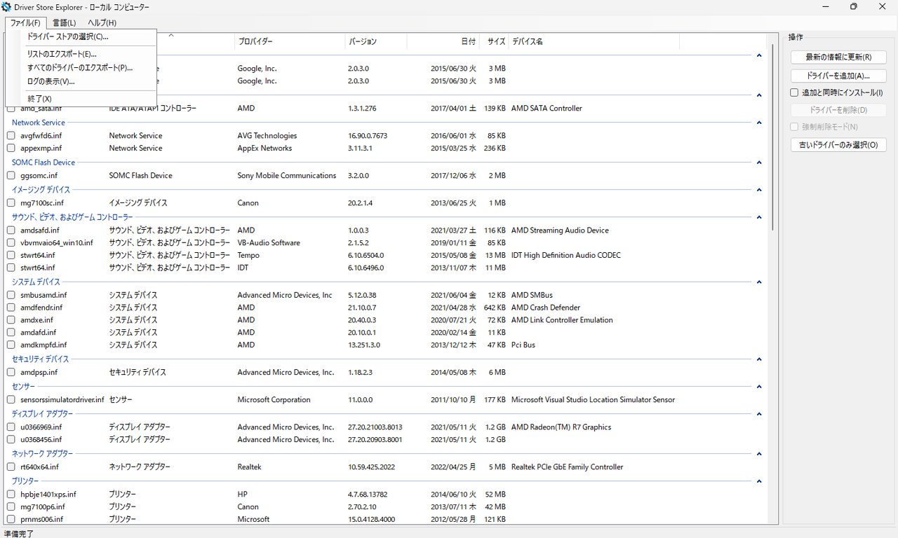 再起動後、間違って使用しているドライバーを削除してしまっていた場合はDriverStore Explorerでドライバーの追加を行い、もう一度再起動します。そうするとドライバーは自動的に再インストールされます。