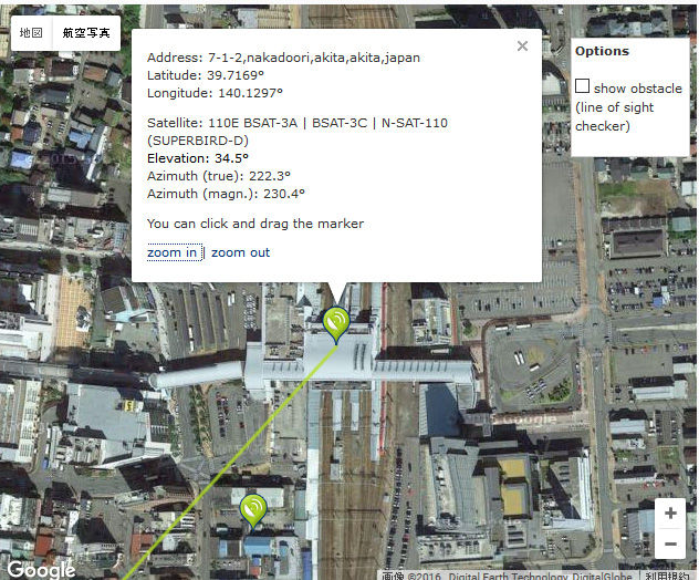 そこで、google earthの画像を使って、どの方向・どの角度に衛星があるか一発で表示してくれるサイトをご紹介しましょう。