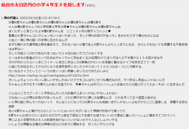 2012年の夏から秋にかけて、インターネット掲示板を使用して13件の殺害予告や襲撃予告がありました。当初、操作本部は今までの操作方法と同様に捜査をし、東京都と大阪府・福岡県・三重県のそれぞれ男性4人を逮捕しました。