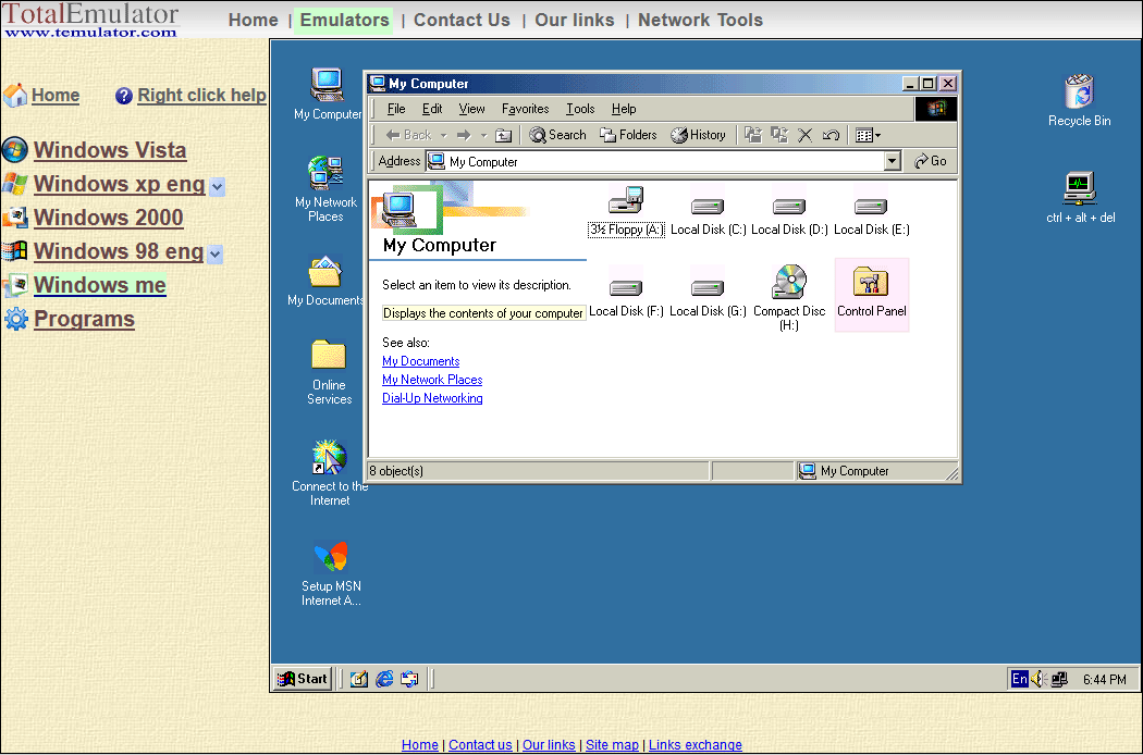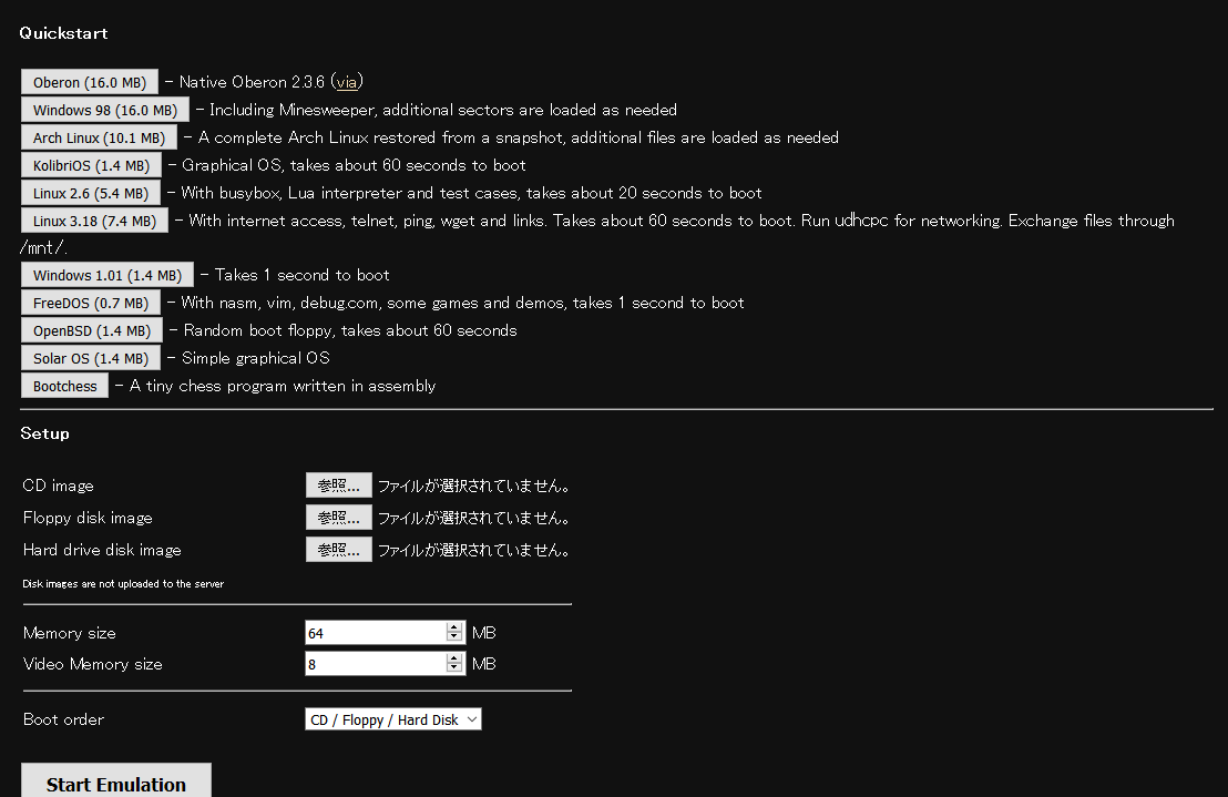 このサイトは昔なつかしフロッピーやPS2マウス、VGAコントローラーなどをサポートしており、本当に昔のWindows98といった感じです。