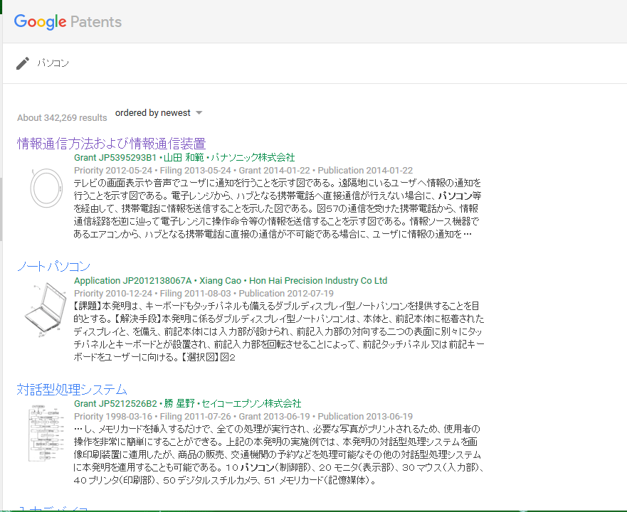 なお、googleでは特許の検索は最近できたらしく整備中で、タイトルの下に図解の絵がついている場合は、特許内容の記事の中に図解もついていますが、古い特許などは図解がついていない場合があります。