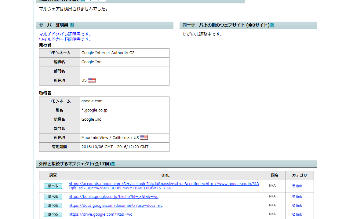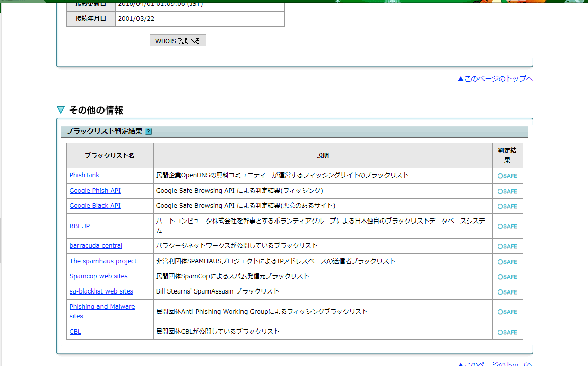 なお、サーバ-レベルで判定しているため、同一サーバー上でブラックリストに載っているサイトがある場合はきちんとしたサイトでも判定結果が赤くつく場合があります。